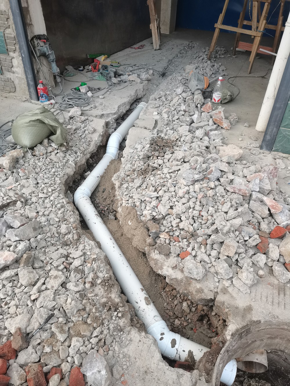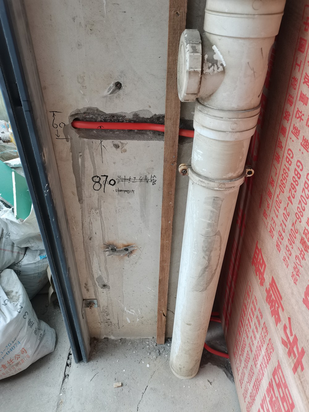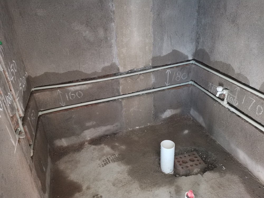 卫生间排污主管引至外面的污水井,增加二次排水和洗手盆墙排。下面是从污井到卫生间的排水管照片。