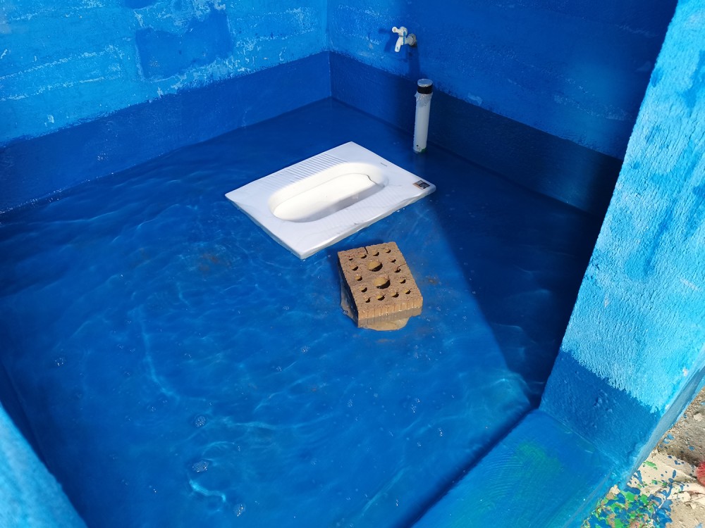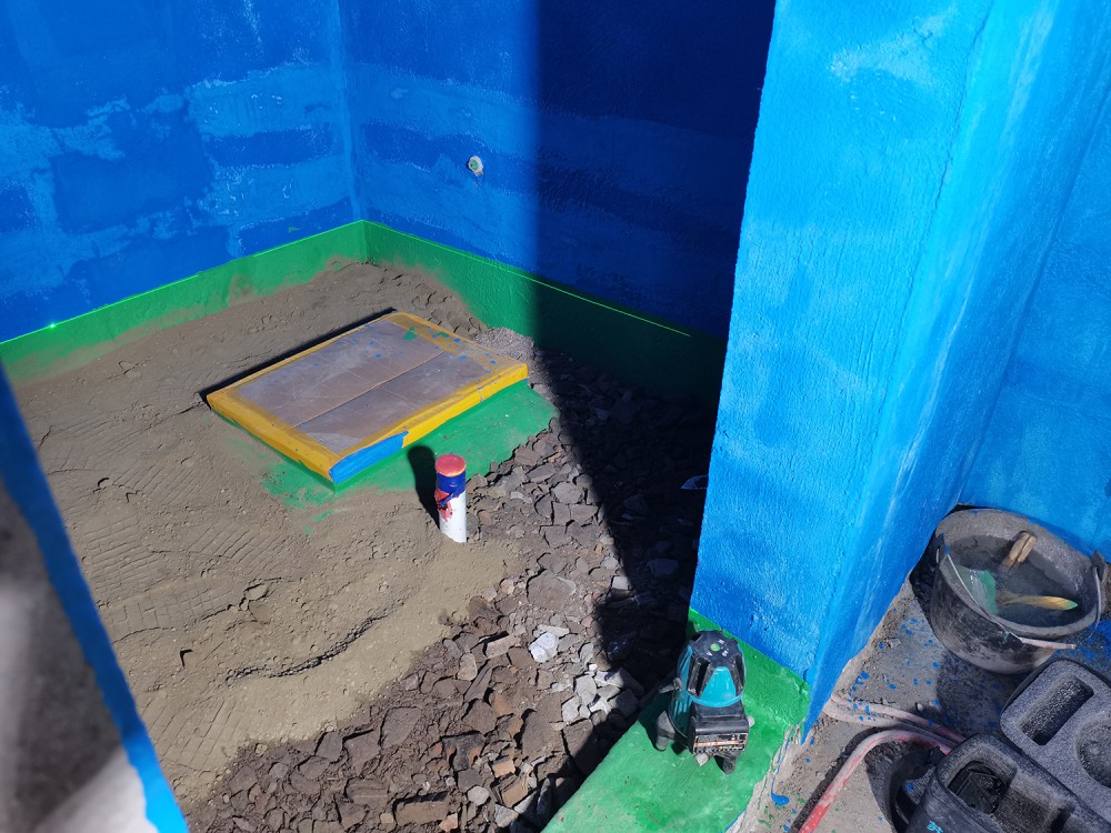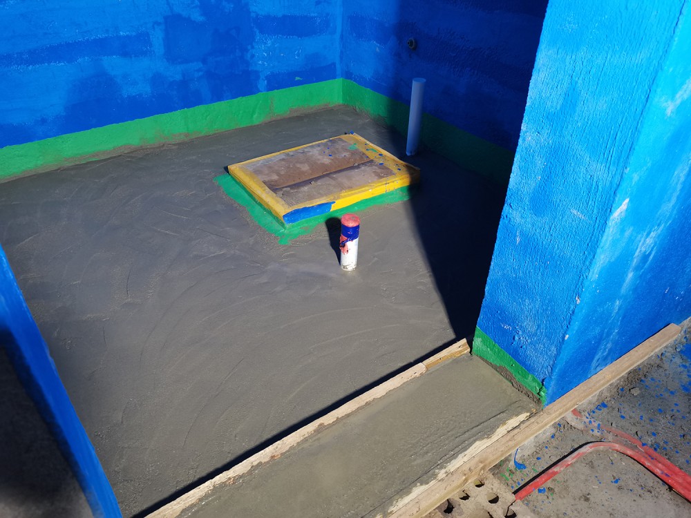 卫生间找平后、刷堵漏灵,刷地面防水第一遍